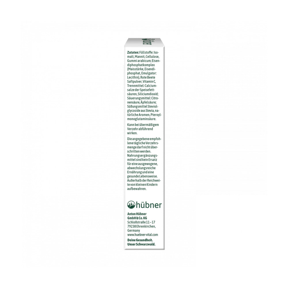 Inhaltsstoffe Füllstoffe: Isomalt, Mannit, Cellulose, Gummi arabicum; Eisendiphosphatkomplex (Maisstärke, Eisendiphosphat, Emulgator: Lecithin), Rote Beete Saftpulver, Vitamin C, Trennmittel: Calciumsalze der Speisefettsäuren, Siliciumdioxid; Säuerungsmittel: Citronensäure, Äpfelsäure; Süßungsmittel Steviolglycoside aus Stevia, natürliche Aromen, Pteroylmonoglutaminsäure.