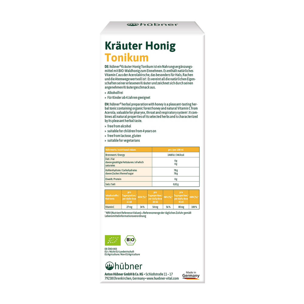 hübner® Kräuter Honig Tonikum ist ein Nahrungsergänzungsmittel mit BIO-Waldhonig zum Einnehmen. Es enthält natürliches Vitamin C aus der Acerolakirsche, das besonders für Hals, Rachen und die Atemwege wertvoll ist*. Außerdem enthält es ätherische Öle aus Kräutern und Ingwer für das allgemeine Wohlbefinden. Das Tonikum vereint all die natürlichen Eigenschaften seiner erlesenen Kräuter und zeichnet sich durch seinen angenehmen Kräutergeschmack aus.