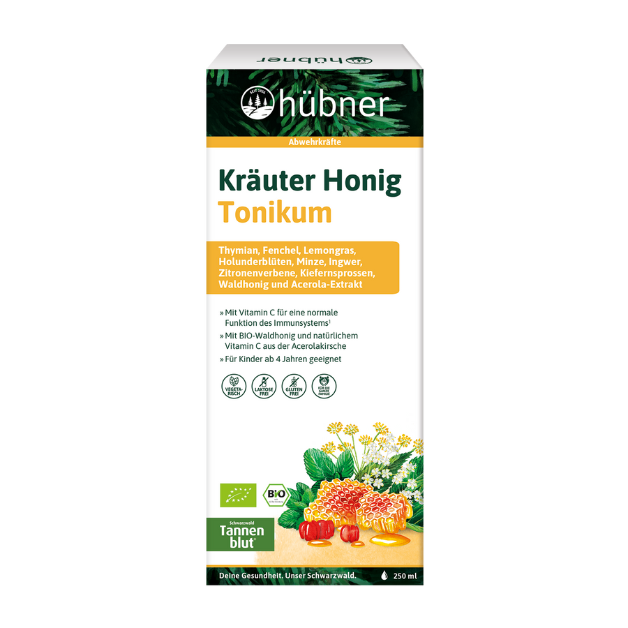 hübner® Kräuter Honig Tonikum in Bio-Qualität mit BIO Waldhonig und natürlichem Vitamin C, das zu einer normalen Funktion des Immunsystems beiträgt. Alter Name: Tannenblut® BIO Kräuter-Tonikum mit Honig.