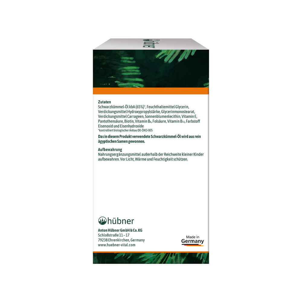 Schwarzkümmelöl (67,9 %), Trennmittel Mono- und Diglyceride von Speisefettsäuren, Vitamin E, CalciumPantothenat, Vitamin B6, Antioxidationsmittel Tocopherol, Folsäure, Biotin, Vitamin B12, Kapselhülle: Gelatine, Feuchthaltemittel Glycerin, Wasser, Feucht-haltemittel Sorbit, Farbstoff: Eisenoxid.