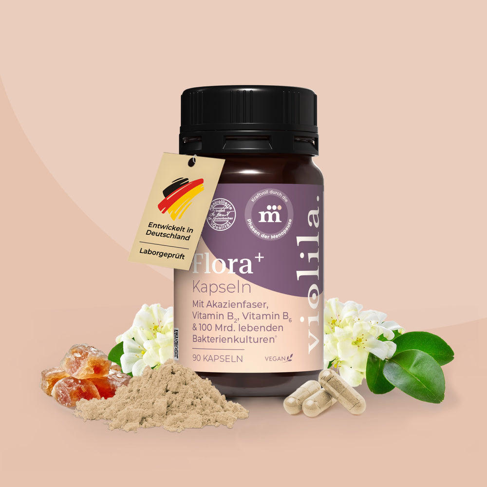 Die Flora+ Kapseln von violila kombinieren 23 sorgfältig ausgewählte Bakterienstämme mit Vitamin B2 (Riboflavin), Vitamin B6 (Pyridoxin) und Akazienfaser.