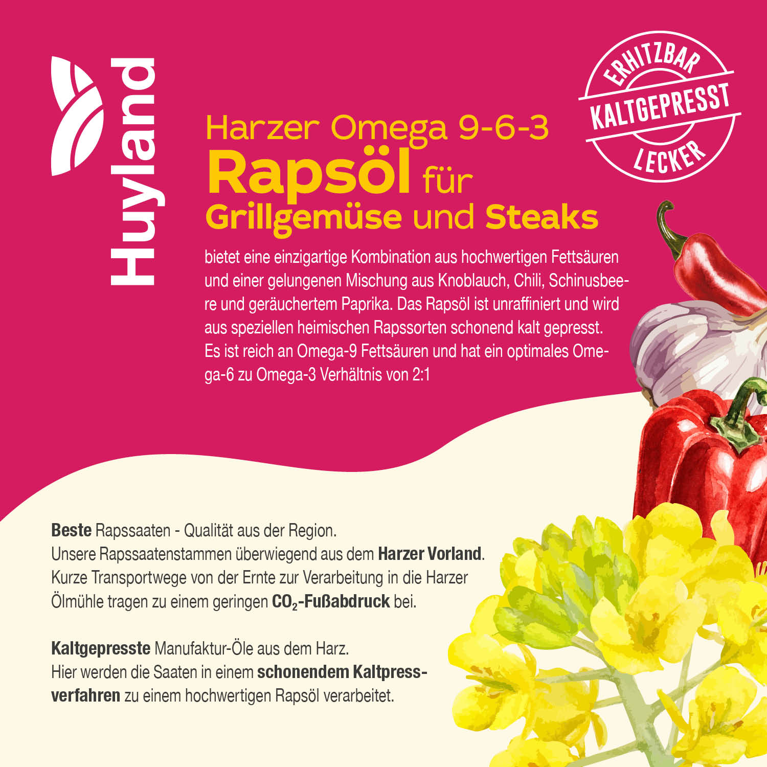 Harzer Rapsöl für Grillgemüse und Steak ist ein vielseitiges und gesundes Öl, das sich perfekt mit einer aromatischen Kräutermischung aus Knoblauch, Chili, Schinusbeere und geräuchertem Paprika kombinieren lässt. Ob zum Braten, Grillen oder als Basis für Marinaden—die Möglichkeiten sind nahezu unbegrenzt. Probieren Sie es aus und bereichern Sie Ihre Küche mit diesen köstlichen Aromen!