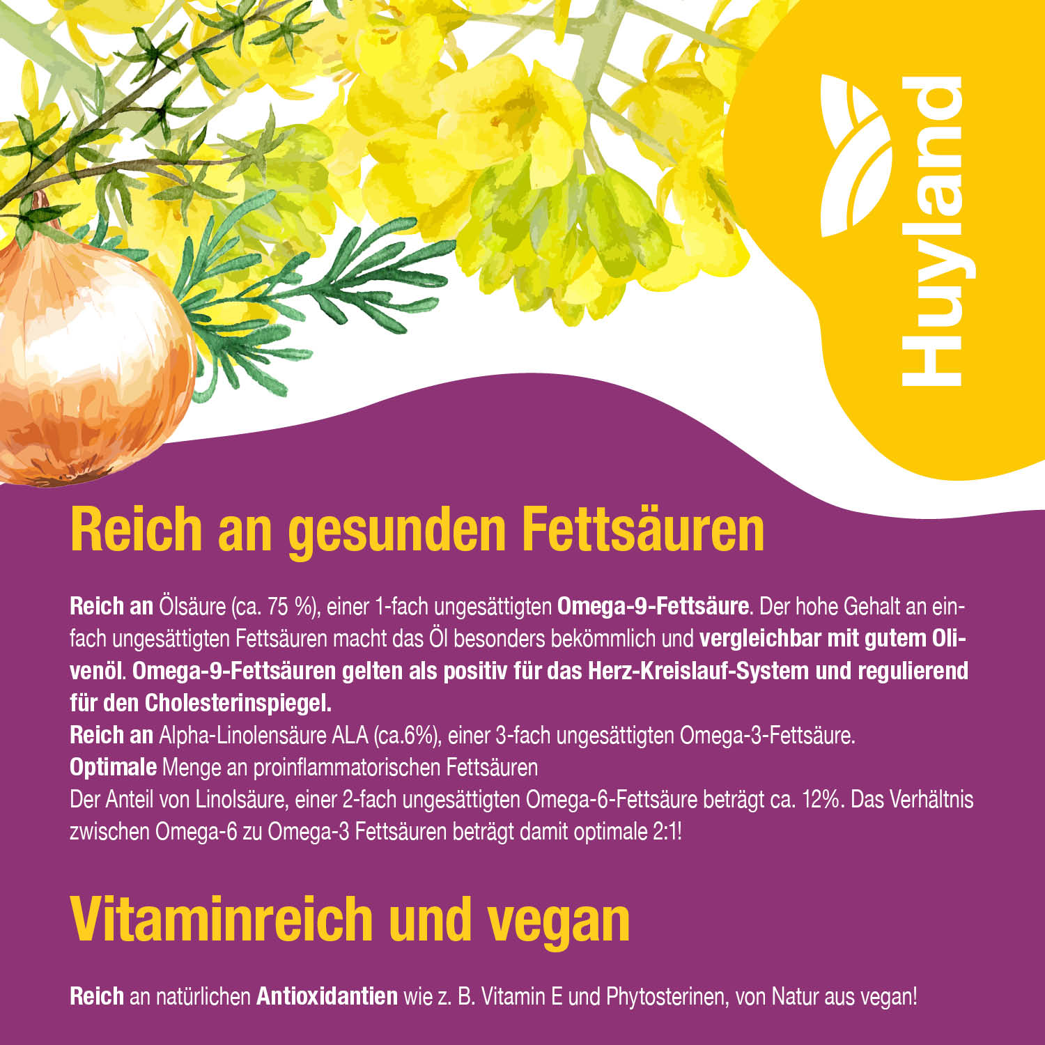 Harzer Rapsöl für Ratatouille und Ofengemüse zeichnet sich durch einen hohen Gehalt an Ölsäure aus—ganze 75%. Dieser hohe Anteil an einfach ungesättigten Fettsäuren bietet zahlreiche gesundheitliche Vorteile:
