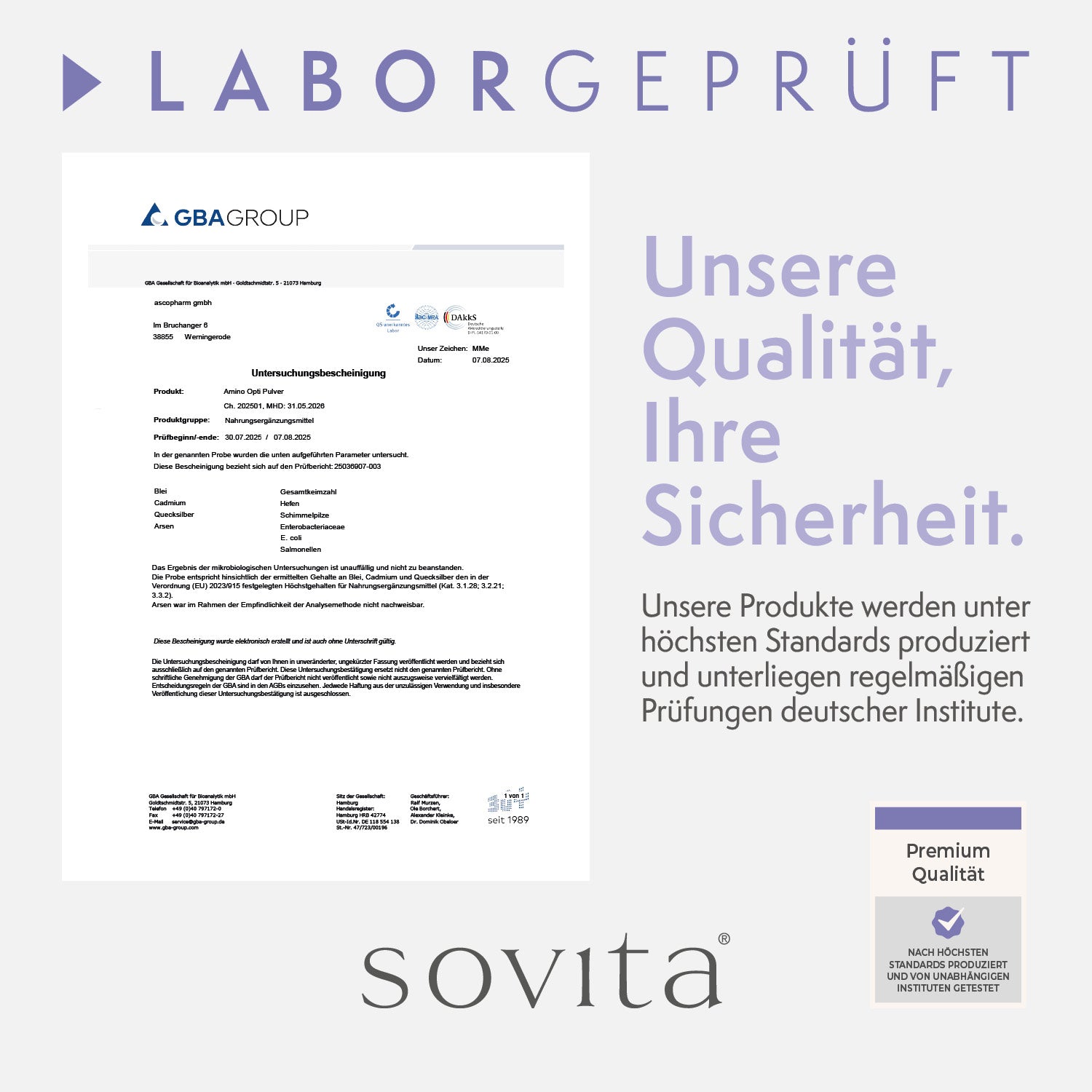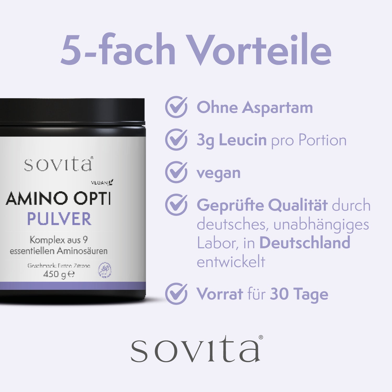 Das Amino Opti Pulver liefert eine gezielte Kombination aus 9 essenziellen Aminosäuren, ergänzt mit Vitamin B 6 , und eignet sich ideal zur proteinreichen Ergänzung bei sportlicher Aktivität. Die enthaltenen Aminosäuren – darunter Lysin, Methionin, Leucin, Valin und