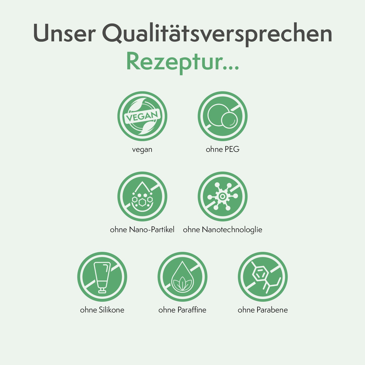 Frei von Paraffinen, Parabenen, Silikonen, PEG und ohne Nano-Partikel.