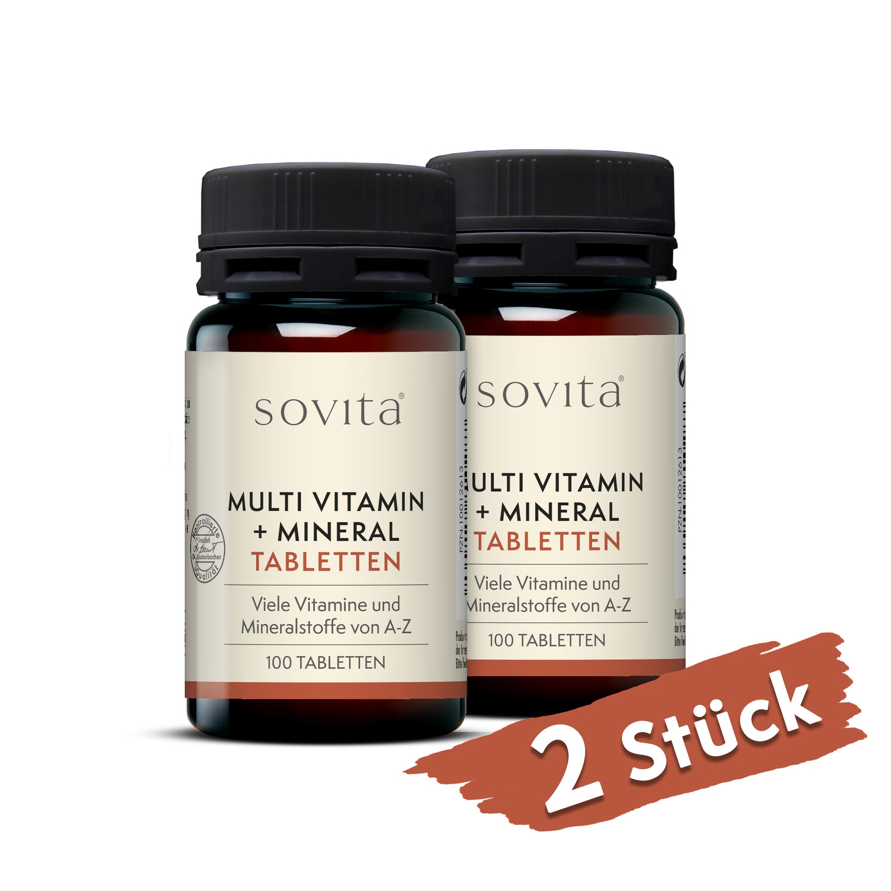 Braune Dose sovita Multi Vitamin + Mineral Tabletten mit drei beigen Tabletten auf weißem Hintergrund