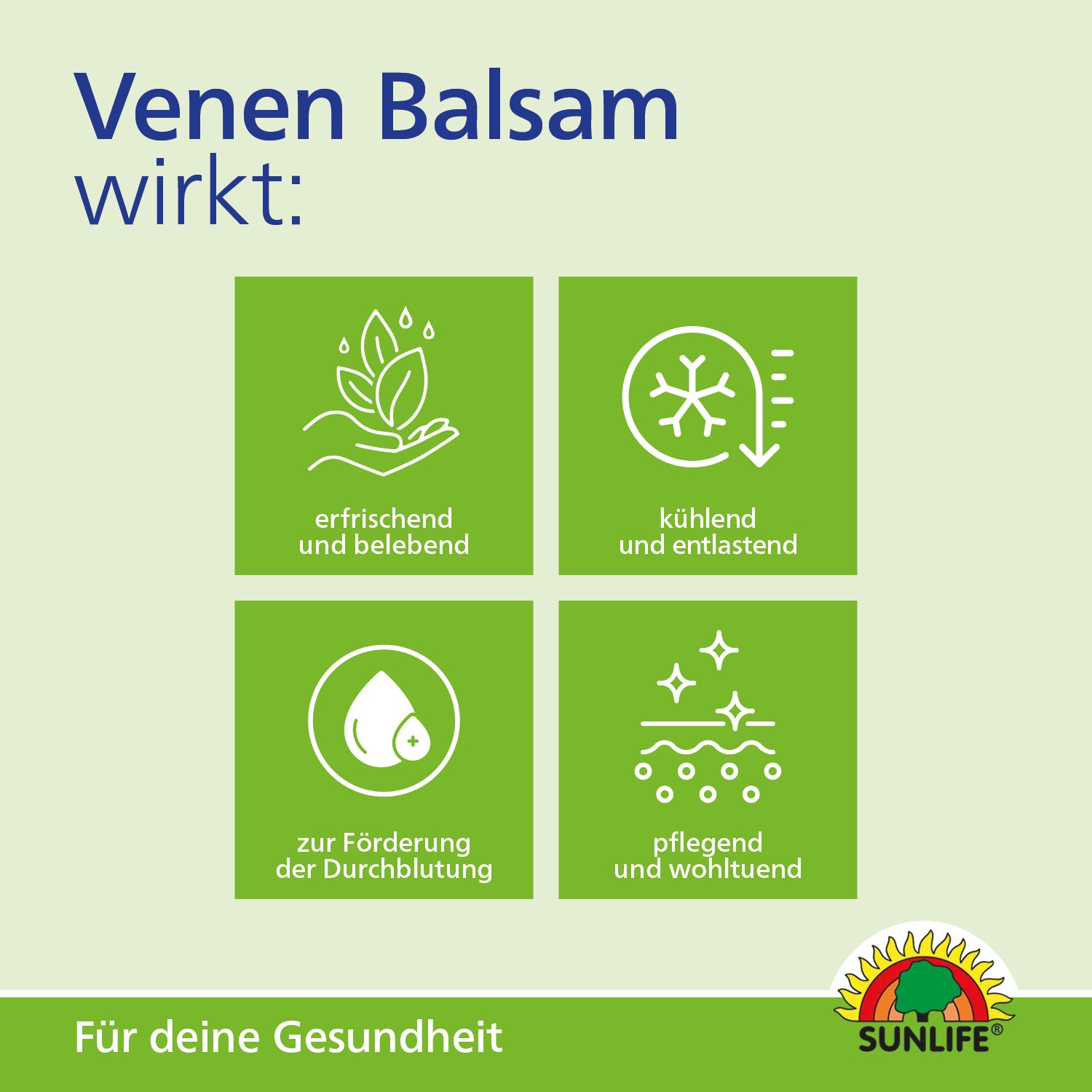 SUNLIFE® Venenbalsam wirkt belebend und erfrischend. Schon beim Einmassieren werden Sie den aktivierenden und angenehm kühlenden Effekt von Kampher und Menthol spüren.