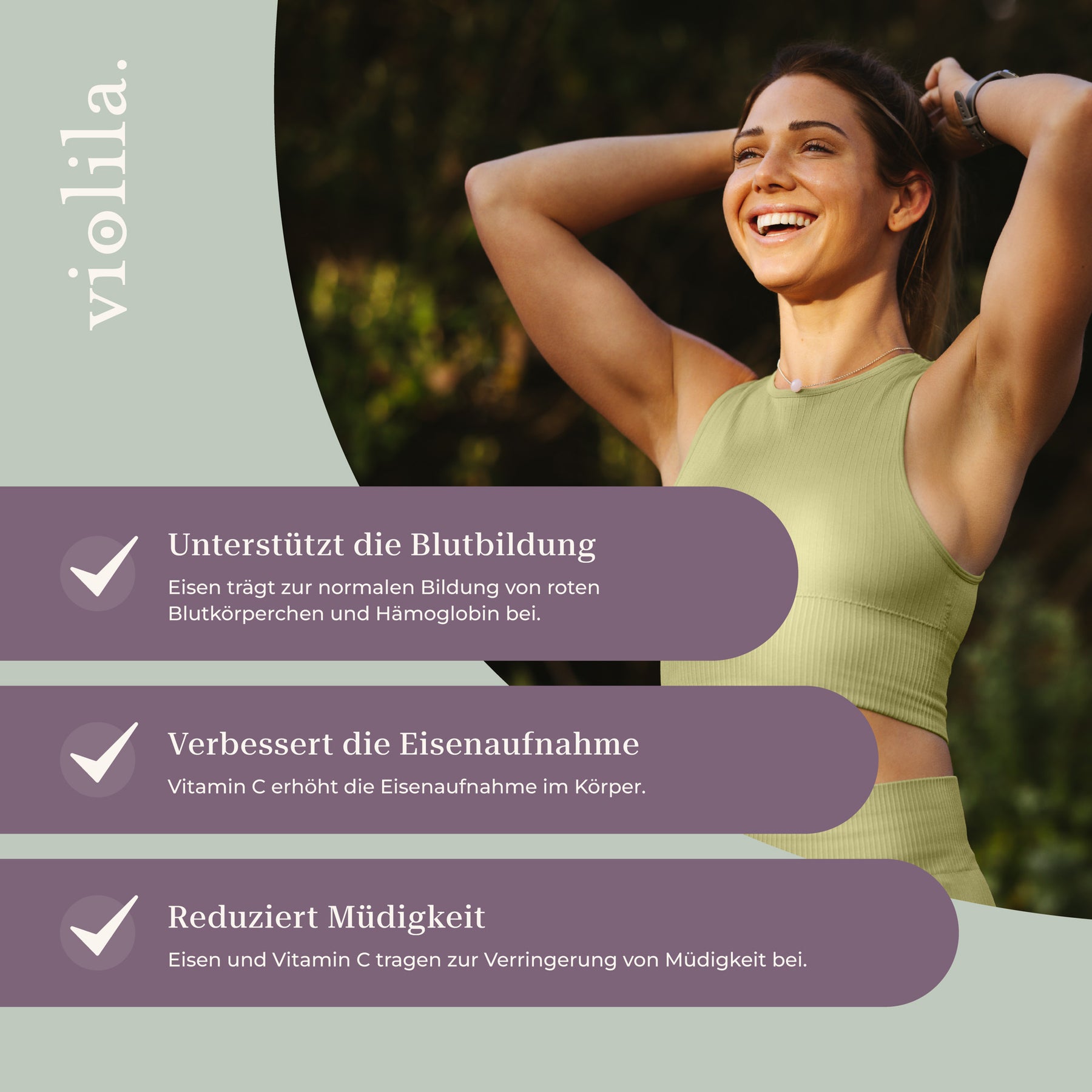 Die Eisen + Vitamin C Kapseln von violila enthalten eine Kombination aus 5 mg Eisen und 20 mg Vitamin C pro Tagesdosis.