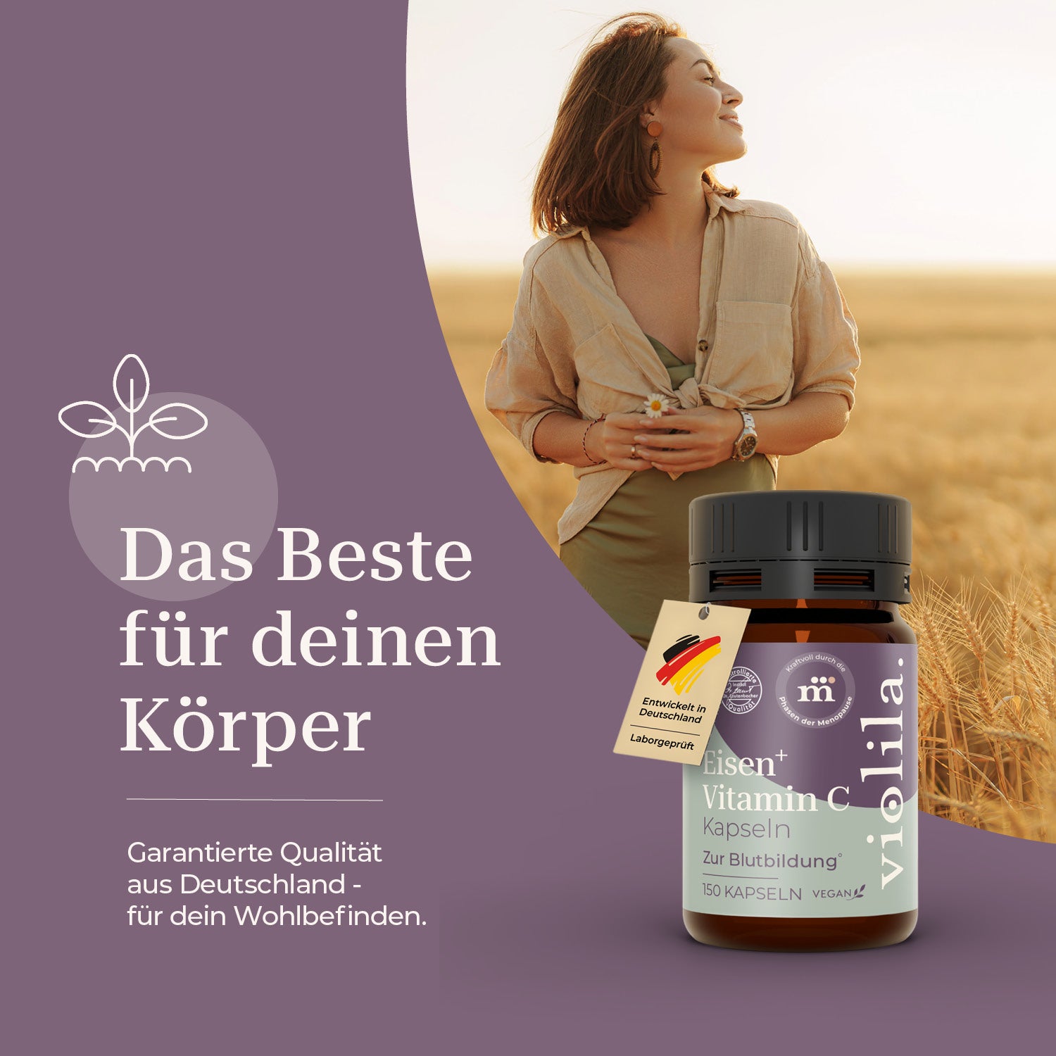 Die Kombination in den Eisen + Vitamin C Kapseln bietet eine geeignete Mikronährstoffergänzung für Frauen in dieser besonderen Lebensphase.