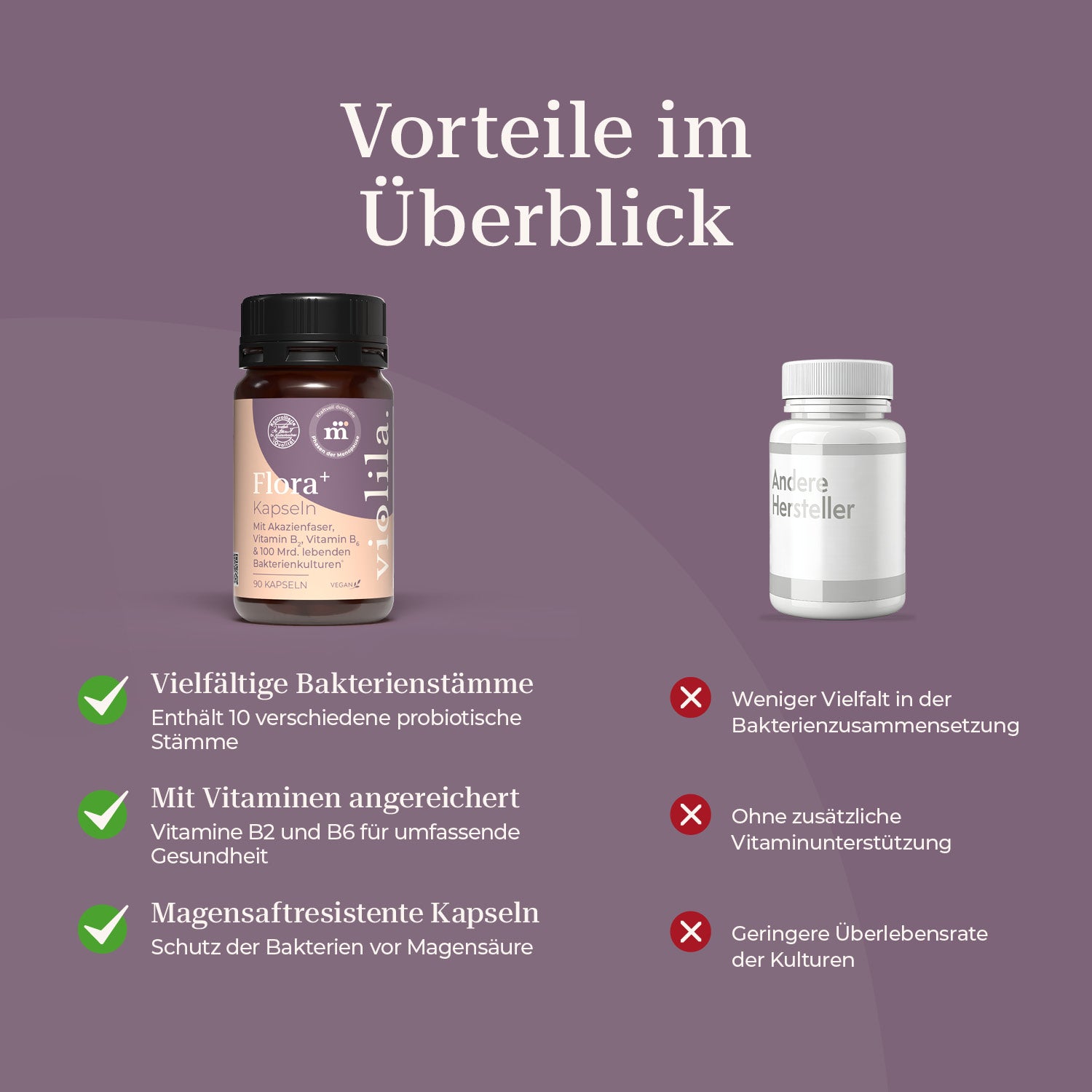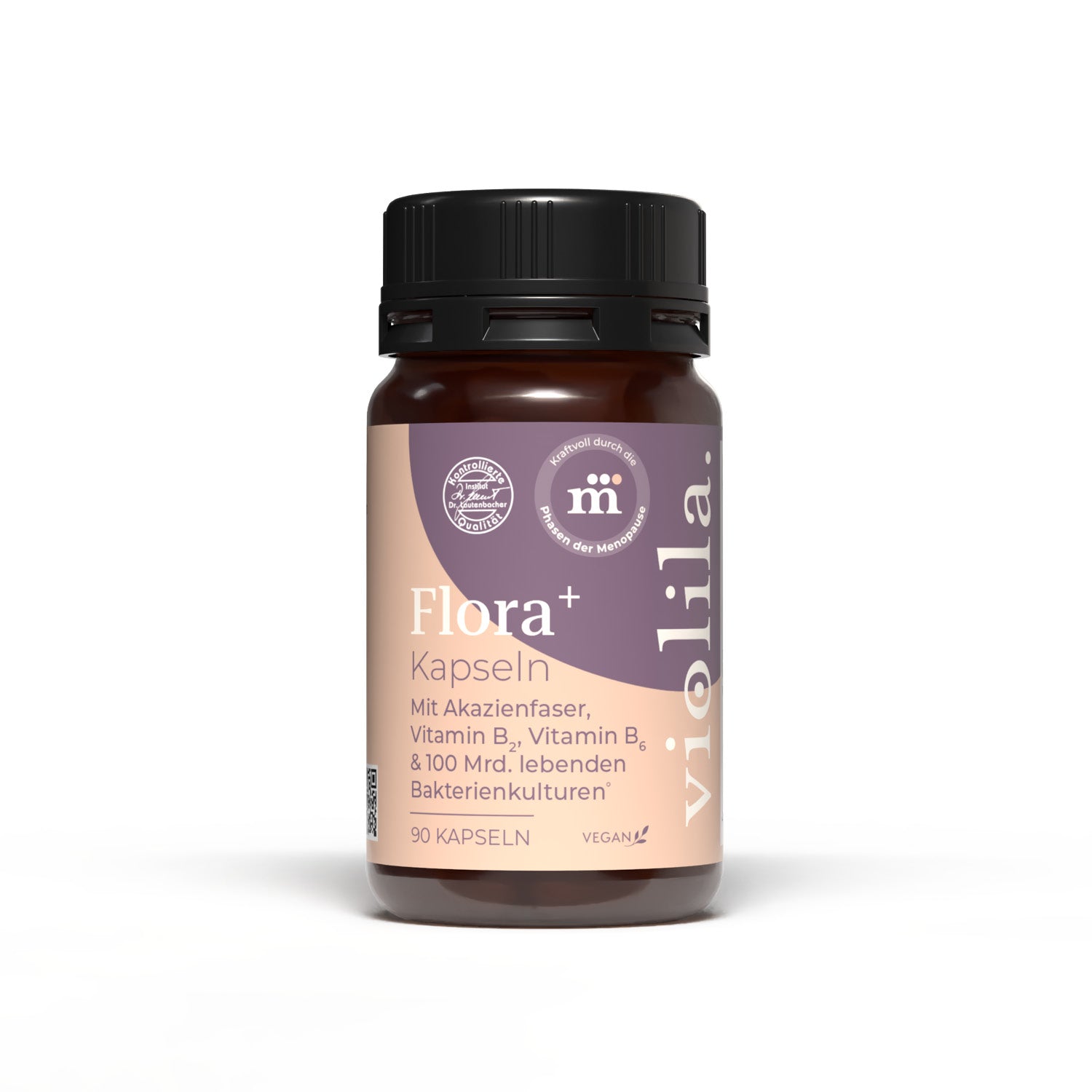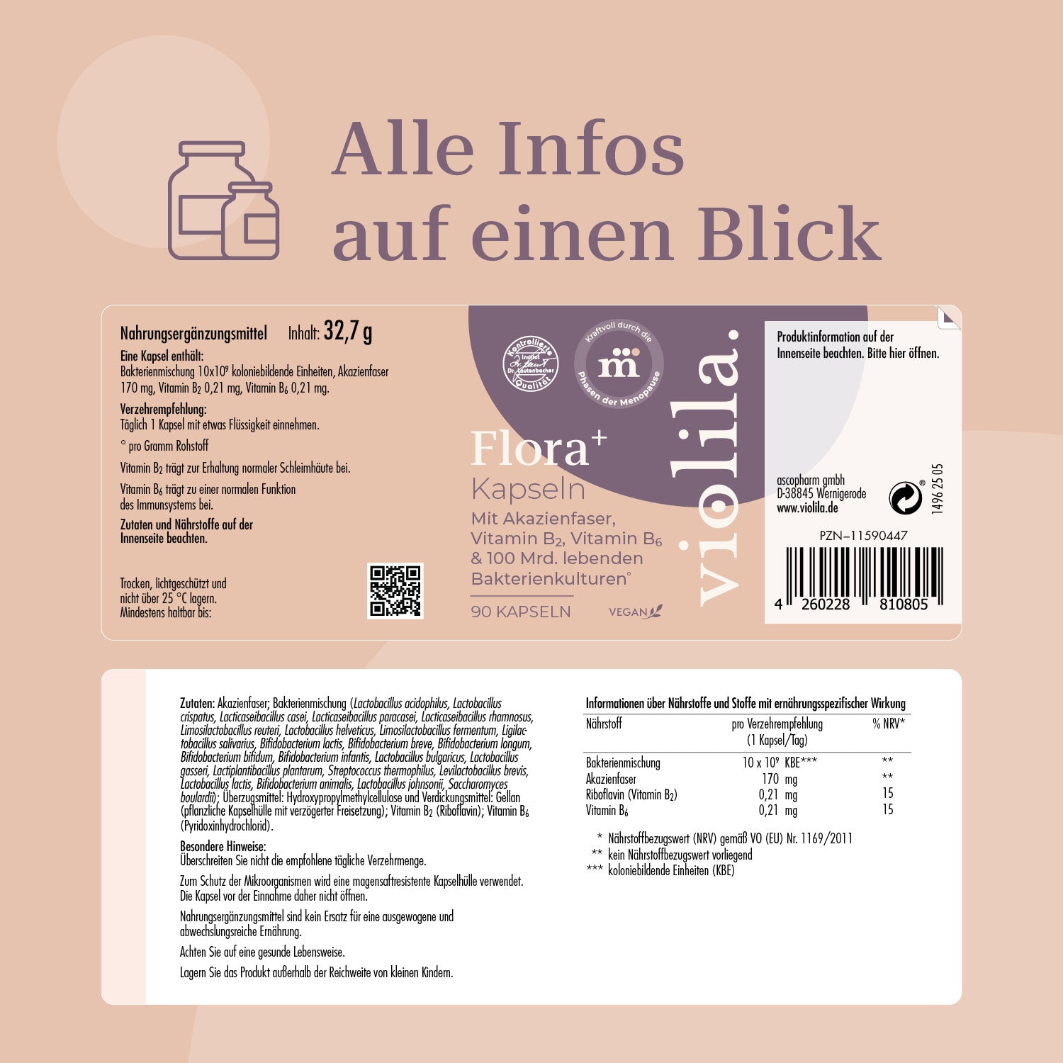 Die Flora+ Kapseln von violila kombinieren 23 sorgfältig ausgewählte Bakterienstämme mit Vitamin B2 (Riboflavin), Vitamin B6 (Pyridoxin) und Akazienfaser.