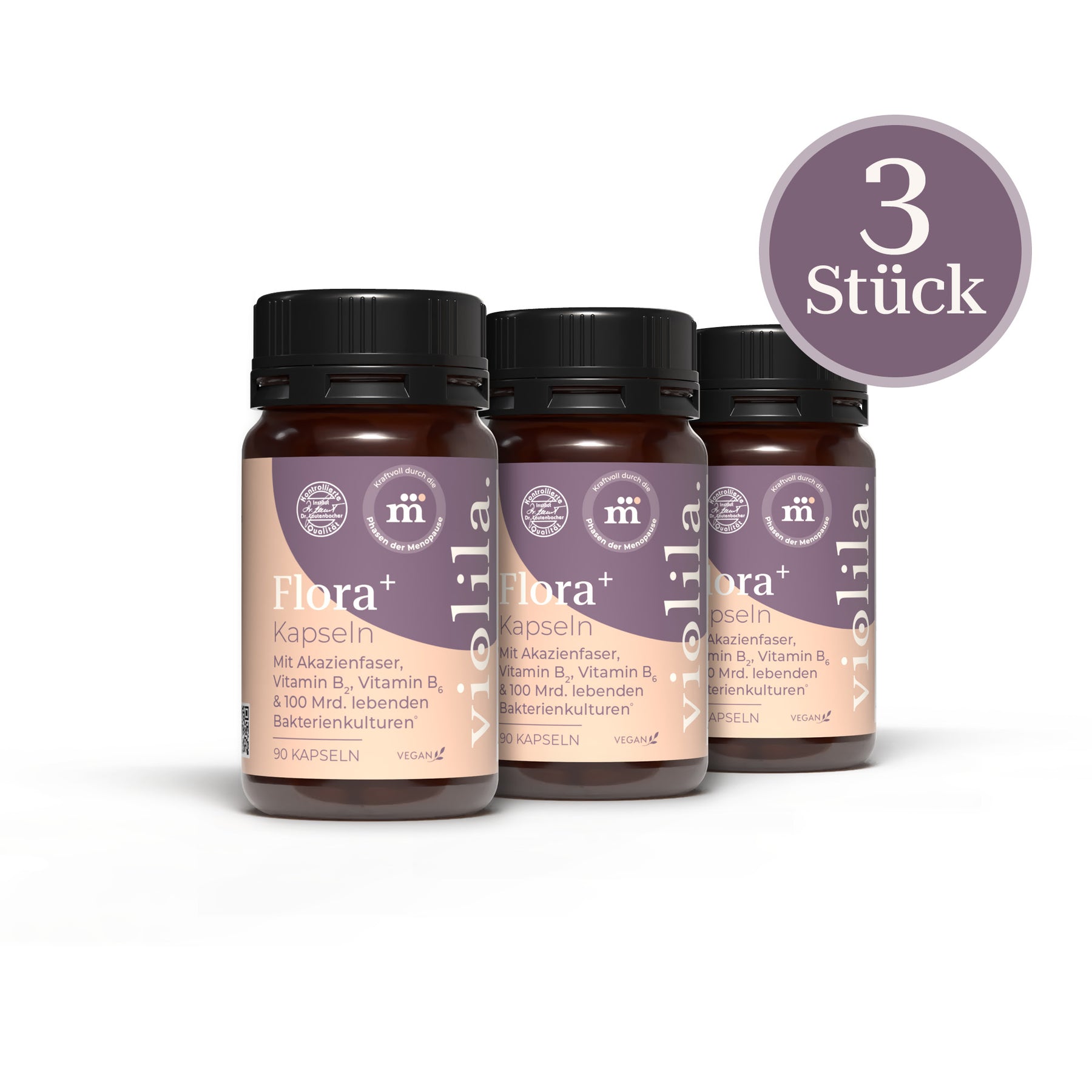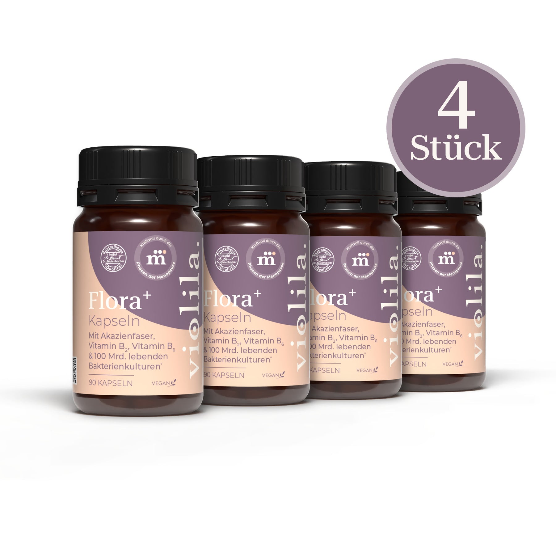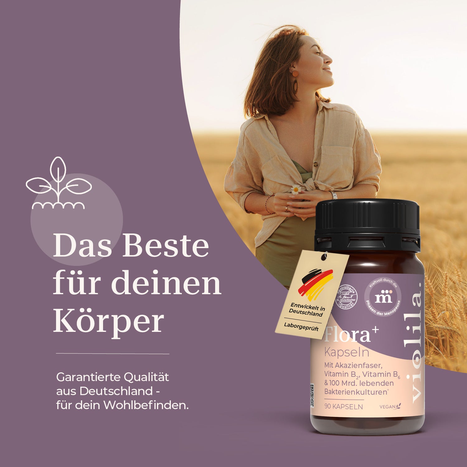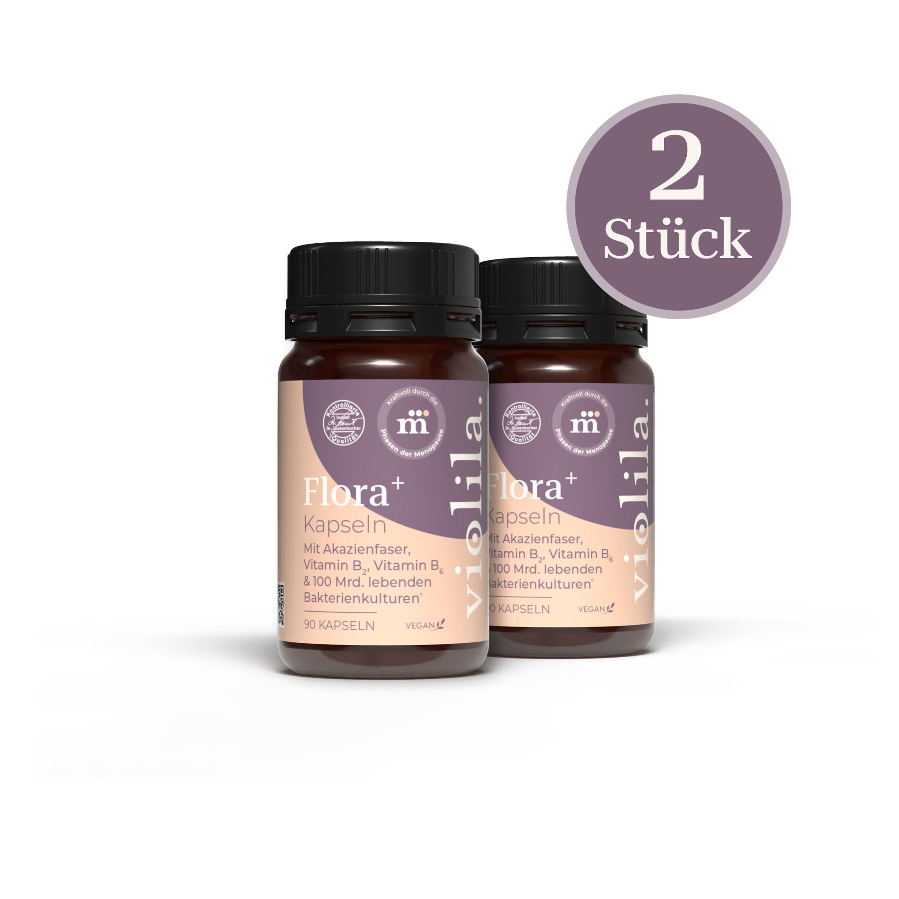 Die Flora+ Kapseln von violila kombinieren 23 sorgfältig ausgewählte Bakterienstämme mit Vitamin B2 (Riboflavin), Vitamin B6 (Pyridoxin) und Akazienfaser.