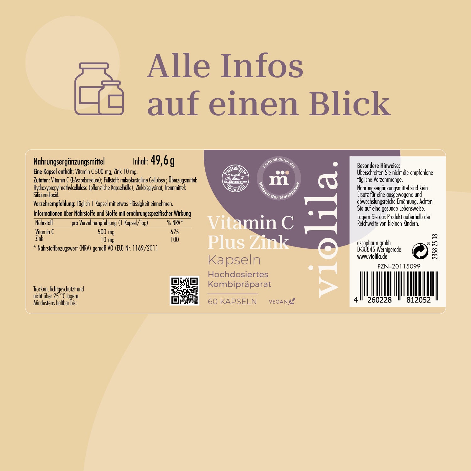 violila Vitamin C Plus Zink Kapseln enthalten 500 mg Vitamin C und 10 mg Zink – zwei essenzielle Mikronährstoffe, die sich in ihrer Wirkung ideal ergänzen.
