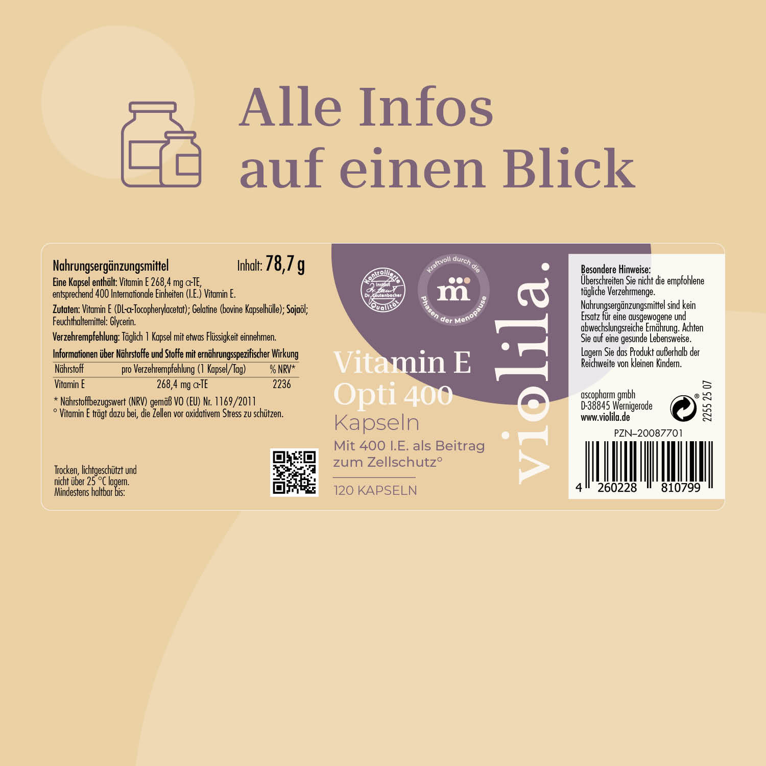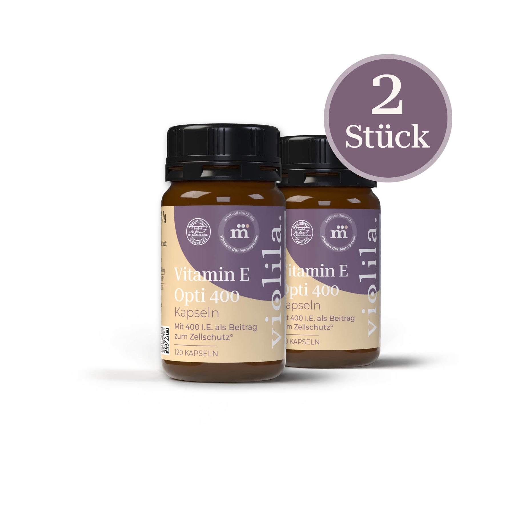 violila Vitamin E Opti 400 Kapseln enthalten hochdosiertes, fettlösliches Vitamin E – mit 268,4 mg α-TE (400 I.E.) pro Kapsel.